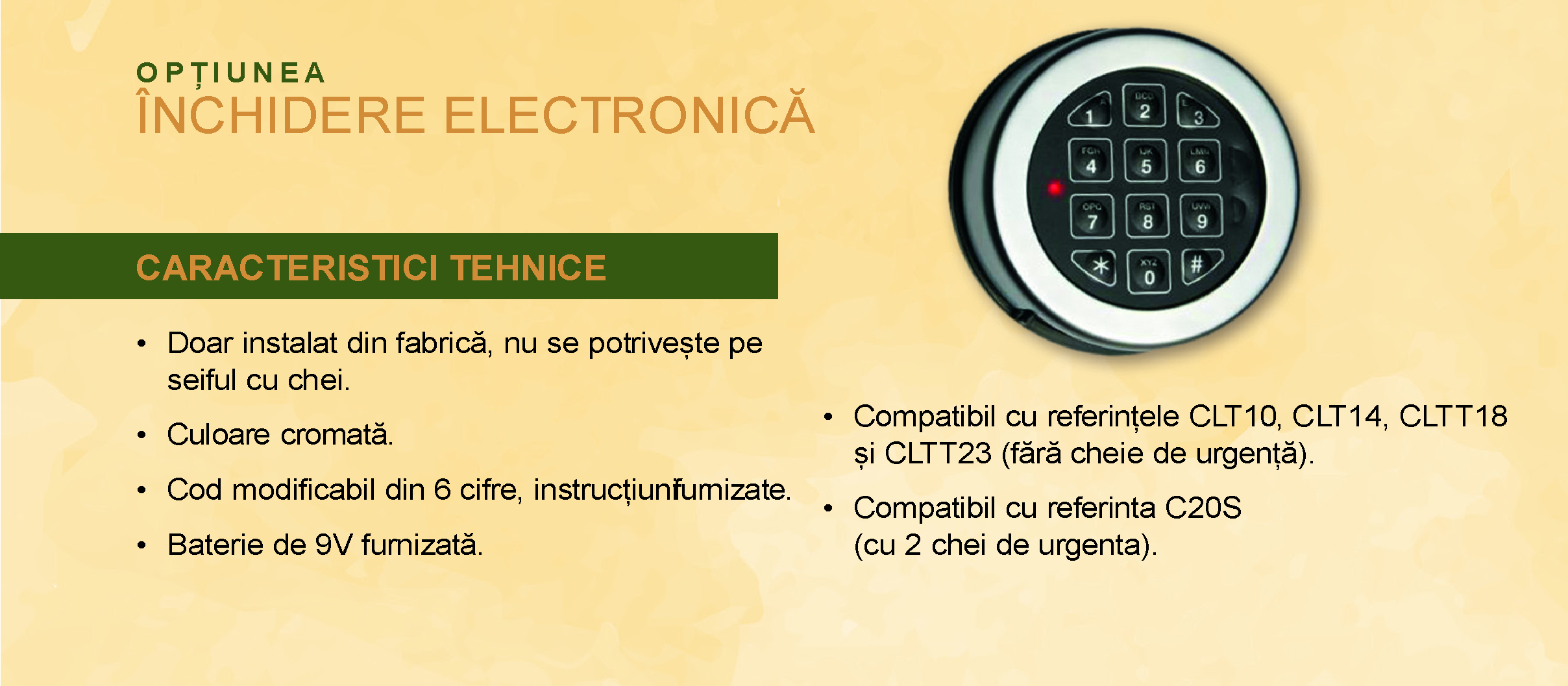 • Doar instalat din fabrică, nu se potrivește pe seiful cu chei.